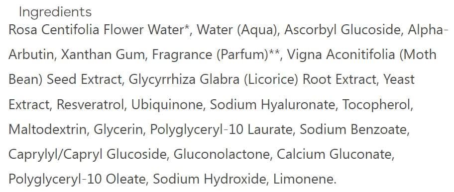 Rosa Centifolia Flower Water*, Water (Aqua), Ascorbyl Glucoside, Alpha-Arbutin, Xanthan Gum, Fragrance (Parfum)**, Vigna Aconitifolia (Moth Bean) Seed Extract, Glycyrrhiza Glabra (Licorice) Root Extract, Yeast Extract, Resveratrol, Ubiquinone, Sodium Hyaluronate, Tocopherol, Maltodextrin, Glycerin, Polyglyceryl-10 Laurate, Sodium Benzoate, Caprylyl/Capryl Glucoside, Gluconolactone, Calcium Gluconate, Polyglyceryl-10 Oleate, Sodium Hydroxide, Limonene.